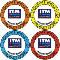 Keuringsstickers communiceren de status en datum van inspecties voor veiligheid van machines en apparatuur. ITM Interma levert sinds 1990 keuringsstickers aan bedrijven, installateurs en inspectiebedrijven in Nederland en België. Verkrijgbaar in ronde formaten 30-50mm diameter conform NEN-3140 en ISO 7010. Materialen: vinyl, polyolefine, polyester. Kleuren: groen, paars, zwart-wit. Met inschuifbare datum-tabbladen voor maandaanduiding. Permanent klevend -40°C tot +80°C. Levertijd standaard 24-48 uur, maatwerk 3-5 werkdagen. Bestel direct online of neem contact op: sales@itminterma.nl of 040-254 70 90.