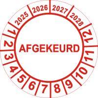 Ronde keuringsstickers met tekstpaar "Gekeurd Op" / "Volgende Keuring" voor inspectie-registratie. Diameter 30-50mm. Kleuren: groen, paars, zwart-wit. Met inschuifbare datum-tabbladen per maand. Zelfklevende vinyl permanent. Voor brandalarmen, EHBO-kasten, koelinstallaties. Stroken van 5 stuks. Bekijk alle stickers.