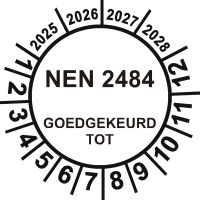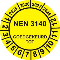 NEN-3140 is Nederlandse norm voor electrische veiligheidsinspecties. Stickers moeten kleurgecodeerd zijn: groen (gekeurd, 12 maanden), paars (vervallen, re-inspectie nodig), wit (neutraal). Diameter minimaal 30mm. Permanent klevend.